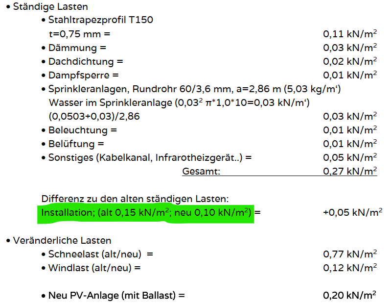 Es wurden Lieferscheine und Vor-Ort Eindrücke kombiniert begutachtet. Darüber hinaus wird in der Statik folgt ein ausdrücklicher Hinweis, dass keine weiteren Lasten an die Dachkonstruktion befestigt werden sollten.
