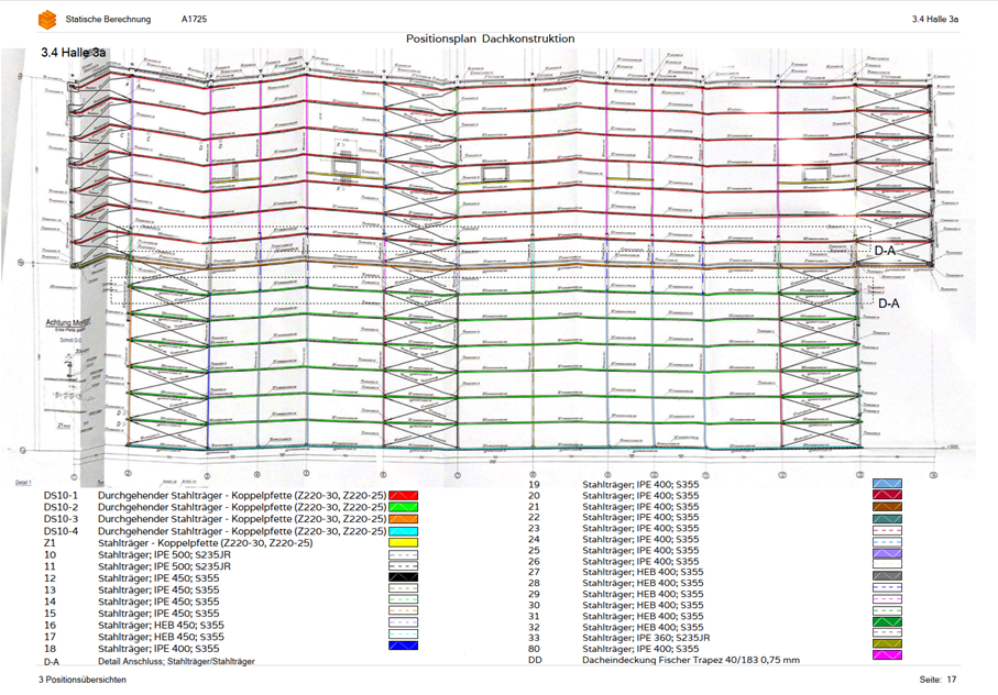 Die Ergebnisse der Ersteinschätzung nach Durchsicht der Dokumente und Vor-Ort Termine konnten mit einem rechnerischen Nachweis bestätigt werden. Die Hallenkonstruktion ist für die vorgegebenen Lastreserven statisch unbedenklich. Die Lastreserven sind allerdings unterschiedlich hoch.