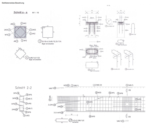 Hier sind unterschiedliche Ansätze denkbar. Im besten Fall ist der Bewehrungsgehalt in Bestandsdokumenten angegeben. Je nach Gesamteindruck vor Ort können die Daten mit einem Sicherheitsabschlag in die PV-Statik übernommen werden. Ein weiterer, eher konservativer Ansatz ist die Annahme einer konstruktiv erforderlichen Mindestbewehrung. Dabei wird von einem vergleichsweise geringen Bewehrungsgehalt ausgegangen. Ein verbesserter Ansatz wäre es, vor Ort einen Bewehrungsscanner einzusetzen, um festzustellen in welchem Abstand Bewehrungsstäbe in Stützen und Bindern verlegt wurden. Dies verbessert die konstruktiven Mindestannahmen.