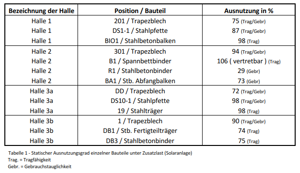 Die in der Spalte 3 angegebene Ausnutzung in Prozent beschreibt die statische Ausnutzung eines Bauteils in Abhängigkeit seiner Tragfähigkeit (Spannungsnachweis) oder Gebrauchstauglichkeit (Durchbiegung). In jeder Halle gab es ein Bauteil, welches maximal ausgelastet ist (z. B. in Halle 1 der Stahlbetonbalken BIO1 mit 98 % statischer Ausnutzung). Im Einzelfall wurde mit begründetem Ingenieursachverstand die leicht erhöhte Ausnutzung (>100 %) begründet und als vertretbar bewertet.